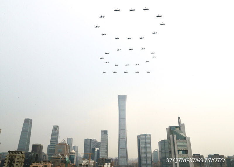 A frota aérea era comandada por um helicóptero multifuncional Z-8L, o mais recente da família de helicópteros militares da China. Acompanhado por dois helicópteros de ataque Z-10, o Z-8L carregava uma bandeira do Partido sob sua fuselagem.
