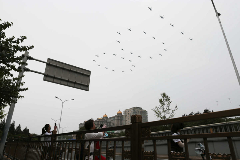 As pessoas tiram fotos de um grupo de helicópteros militares na forma??o do "100" em comemora??o ao centenário do PCCh em Beijing em 1o de julho de 2021. [Foto: Wu Xiaohui / China Daily]