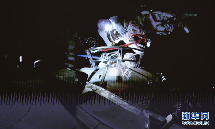 Envergando trajes espaciais EMU (unidade de mobilidade extraveicular) de nova gera??o, os dois astronautas concluíram a instala??o dos apoios para a base da plataforma de trabalho extraveicular no bra?o mecanico, segundo a CMSA.