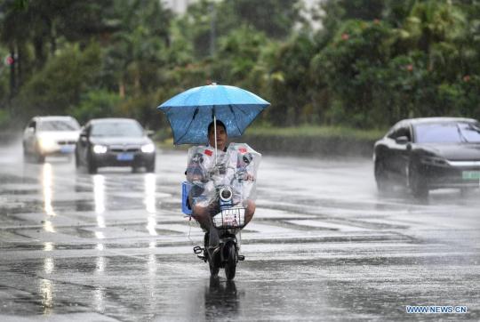 Um residente anda de bicicleta elétrica na chuva em Shenzhen, província de Guangdong, localizada no sul da China, em 19 de julho de 2021. O tuf?o Cempaka, o sétimo este ano, está previsto para atingir a costa de Guangdong na ter?a-feira. (Foto / Xinhua)