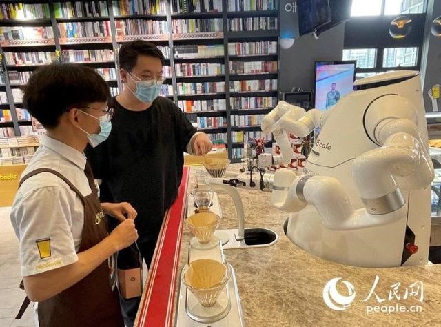 Sob a orienta??o de Chen Xiaolong (à direita), o rob? de servi?o inteligente realizou a reprodu??o e restaura??o de a??es complexas, como preparar café por meio de aprendizado de IA, treinamento com dois bra?os e treinamento visual. No final de 2018, Chen Xiaolong optou por se tornar um técnico de aplica??o com foco na intera??o homem-computador e é responsável pela implanta??o de rob?s. Foto: Xu Weina, Diário do Povo Online
