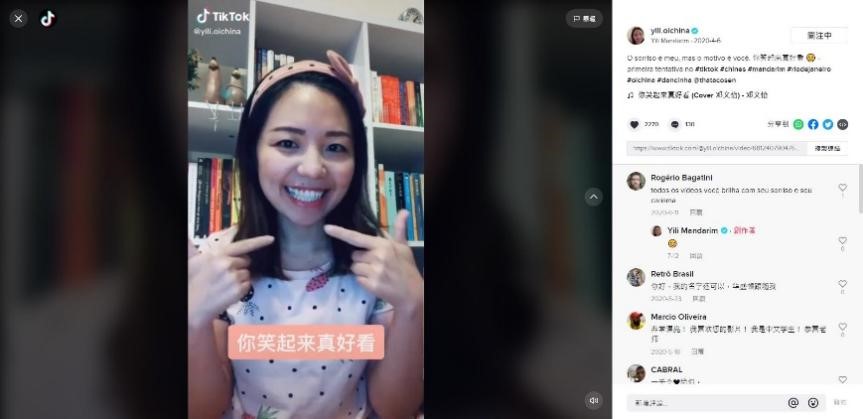 O seu primeiro vídeo foi lan?ado em abril do ano passado - uma música chinesa. No vídeo, ela usa comunica??o n?o verbal para expressar o conteúdo da letra. No entanto, à medida que a epidemia no Brasil se tornou cada vez mais grave, algumas vozes agressivas também surgiram. Ela mencionou: “sempre achei que a cultura brasileira é diversa e inclusiva, e o povo brasileiro caloroso e amigável. N?o esperava que houvesse tantos brasileiros desinformados, preconceituosos e tanta discrimina??o contra a China. Isso me deixou muito triste e indignada, ent?o comecei a fazer vídeos para lhes responder".