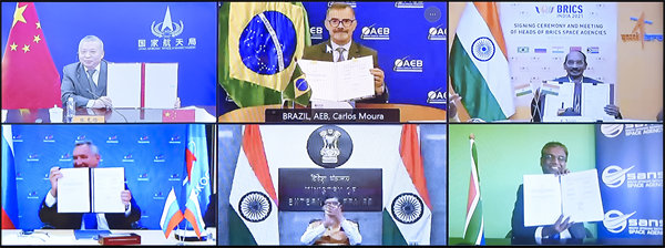 Líderes de agências espaciais do Brasil, Rússia, índia, China e áfrica do Sul compartilharam as atividades atualizadas e assinaram o Acordo de Coopera??o sobre a Constela??o de Satélites de Sensoriamento Remoto do BRICS através de uma videoconferência, de acordo com a administra??o.