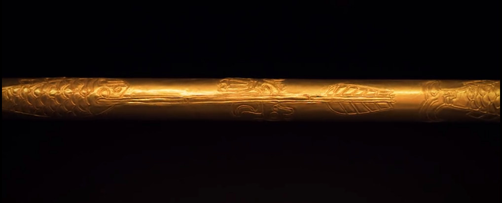 O objeto descoberto em Sanxingdui tem 143 cm de comprimento, 2,3 cm de diametro e pesa 463 gramas, estando decorado com flechas, pássaros, peixes e retratos. De acordo com a análise de especialistas, é muito provável que representativo de direitos políticos e religiosos.