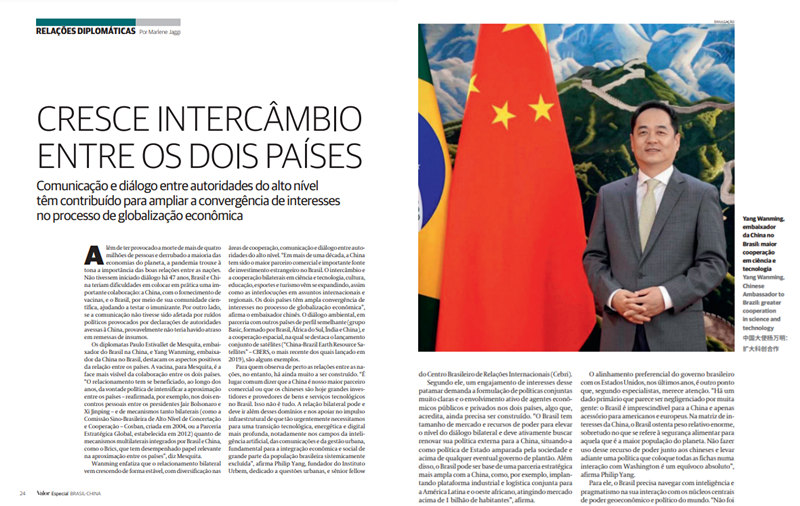 O embaixador chinês no Brasil, Yang Wanming, concedeu uma entrevista ao Valor Econ?mico - maior jornal financeiro brasileiro, para a edi??o especial "Brasil-China: Uma Alian?a Promissora", no dia 31 de agosto. Yang apresentou a recupera??o da economia chinesa sob a epidemia e as conquistas na coopera??o econ?mica e comercial entre a China e o Brasil, e abordou a coopera??o entre os dois países em áreas como combate à epidemia, comércio, investimento, ciência e tecnologia, etc.