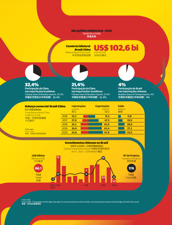 Nos 47 anos desde o estabelecimento das rela??es diplomáticas, as rela??es bilaterais têm se desenvolvido de forma constante em cada vez mais áreas de coopera??o. A China é o maior parceiro comercial do Brasil e um dos principais investidores nos últimos 12 anos. No contexto da pandemia, a agricultura, a minera??o e outras indústrias brasileiras intimamente relacionadas ao comércio da China assumiram a lideran?a na recupera??o, contribuindo para a estabilidade da economia, do emprego e da tributa??o no Brasil. A coopera??o entre a China e o Brasil em investimentos em energia, infraestrutura e outros campos está avan?ando de forma constante, acrescentou Yang.