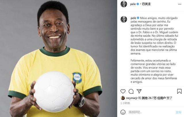 O ex-futebolista brasileiro Edson Arantes do Nascimento, o Pelé, conhecido como o Rei do Futebol, foi submetido a uma cirurgia para retirada de um tumor no cólon na segunda-feira (6), e está em recupera??o. “Vou encarar mais essa partida com um sorriso no rosto, muito otimismo e alegria por viver cercado de amor dos meus familiares e amigos”, publicou o ídolo em suas redes sociais.