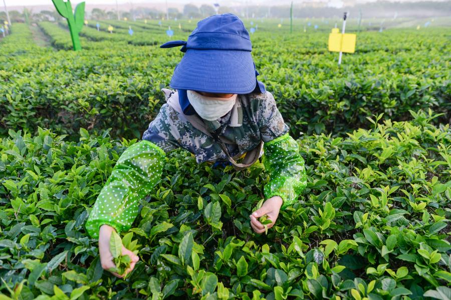Um agricultor colhe folhas de chá em um jardim de chá em Baisha, um distrito aut?nomo da etnia Li, na Província de Hainan, sul da China, 7 de fevereiro de 2021. (Xinhua/Zhou Jiayi)
