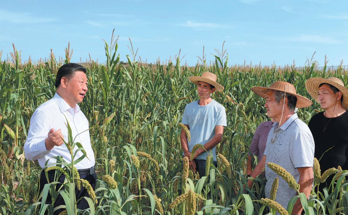 O presidente Xi Jinping, que também é secretário-geral do Comitê Central do Partido Comunista da China, conversou com agricultores em um campo no condado de Mizhi, província de Shaanxi, durante sua inspe??o da província, em 13 de setembro de 2021. [Foto / Xinhua]