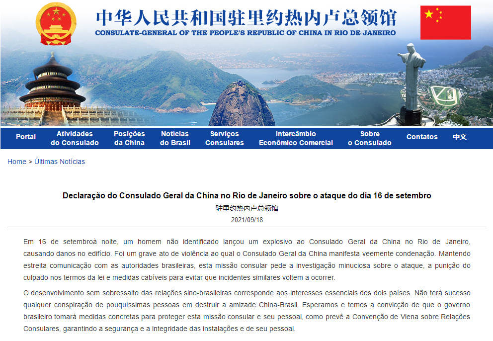 O Consulado Geral da China no Rio de Janeiro no Brasil na sexta-feira (17) condenou veementemente o caso de um homem ter atirado um artefato explosivo no consulado chinês, instando o lado brasileiro a iniciar uma investiga??o em grande escala, prender e punir o infrator.