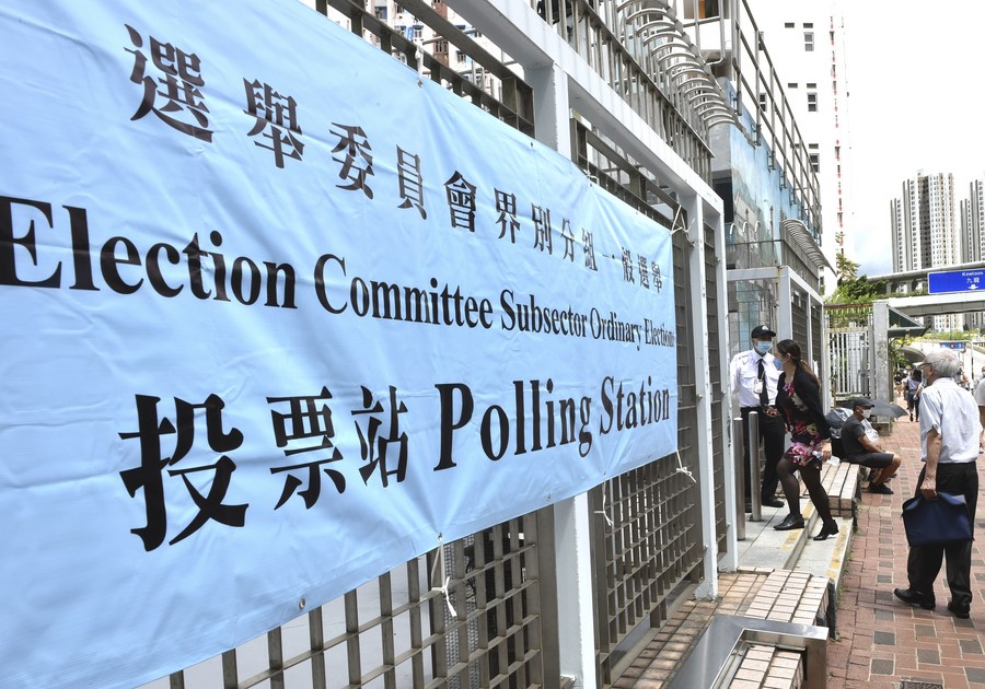 Foto tirada em 19 de setembro de 2021 mostra um posto de voto em Tsuen Wan de Hong Kong, no sul da China. As elei??es ordinárias do subsetor do Comitê Eleitoral de 2021 na Regi?o Administrativa Especial de Hong Kong (RAEHK) da China come?aram na manh? de domingo, a primeira elei??o após as melhorias no sistema eleitoral de Hong Kong no início deste ano. (Xinhua/Lo Ping Fai)