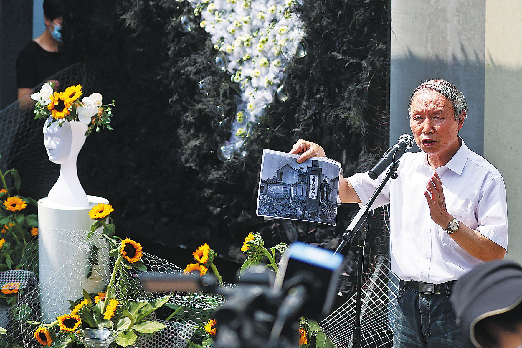 Su Zhiliang, um professor da Universidade Normal de Shanghai, na exposi??o de sábado em Nanjing, província de Jiangsu, mostra evidências dos crimes mostruosos do recrutamento for?ado das “mulheres de conforto” pelas tropas japonesas durante a Segunda Guerra Mundial.