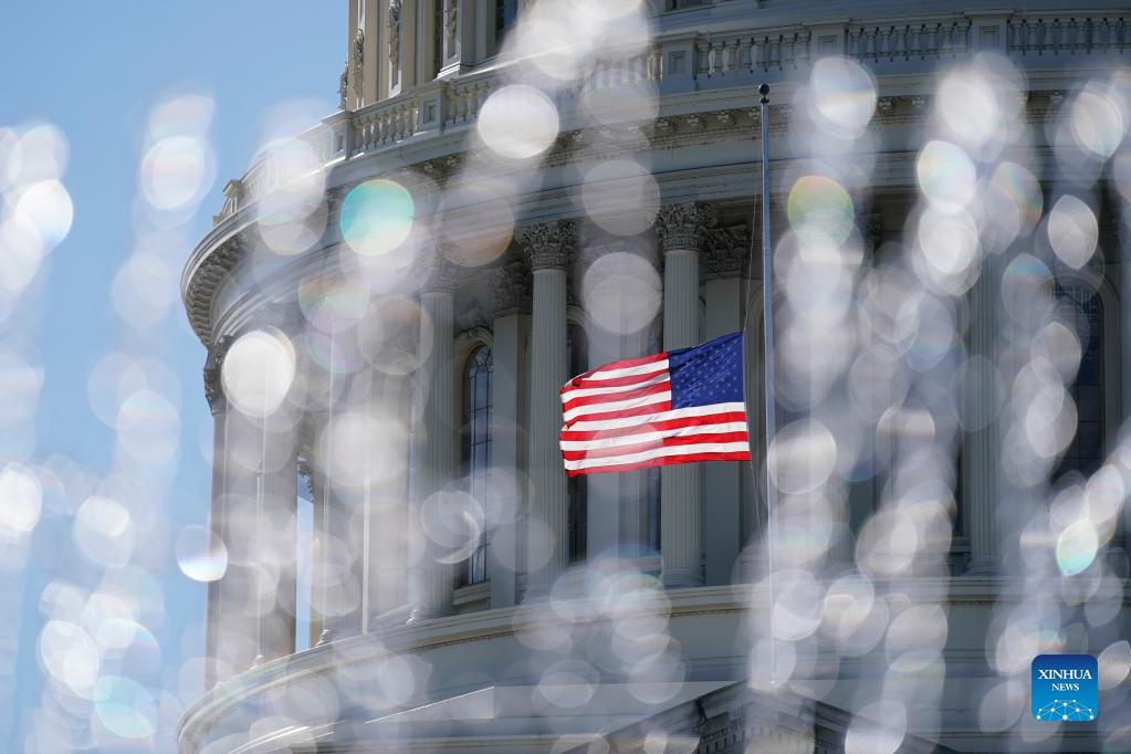 Uma bandeira nacional dos EUA é hasteada a meio mastro no edifício do Capitólio em homenagem ao ex-secretário de Estado dos EUA Colin Powell em Washington, DC, Estados Unidos, em 18 de outubro de 2021. Colin Powell, ex-secretário de Estado e primeiro afro-americano no cargo, morreu aos 84 anos de complica??es da Covid-19, informou sua família na segunda-feira. (Foto: Ting Shen / Xinhua)