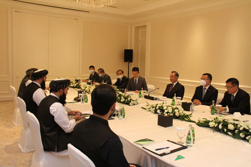 Informando os repórteres sobre suas reuni?es separadas com o vice-primeiro-ministro em exercício, Mullah Abdul Ghani Baradar e o ministro das Rela??es Exteriores, Amir Khan Muttaqi, do governo interino afeg?o do Talib? na capital do Catar, Doha, Wang disse que ouviu declara??es mais positivas das autoridades sobre política interna e externa.