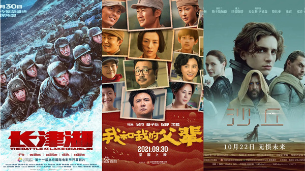 O filme épico "A Batalha do Lago Changjin" liderou a receita mensal, arrecadando 5,29 bilh?es de yuans, a mais alta bilheteria neste ano, tanto na China como no mundo, seguida pela antologia patriótica "Meu País, Meus Pais" (My Country, My Parents) com 1,36 bilh?es de yuans. Seguido por “Duna” (Dune), fic??o científica britanica, adapta??o de um romance de Frank Herbert.