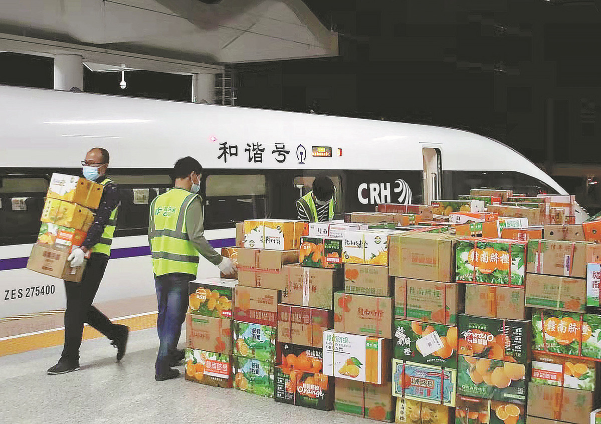 Entregadores transportam pedidos de laranjas de umbigo num trem de alta velocidade em Ganzhou, província de Jiangxi, na quinta-feira (15). [Foto: Ni Shuxun / China Daily]