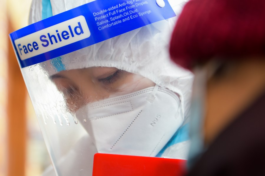 Um membro das equipes de saúde ajuda um residente a apresentar informa??es pessoais de saúde em um local de teste de Manzhouli, regi?o aut?noma da Mongólia Interior, no norte da China, a 29 de novembro de 2021. Foto: Li Zhipeng, Xinhua