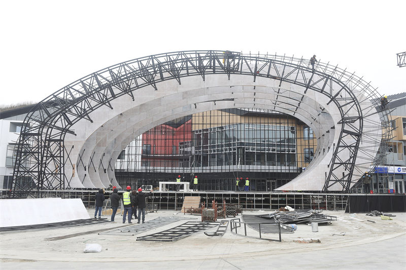 A constru??o do palco da pra?a de premia??o dos Jogos Olímpicos de Inverno de Beijing 2022 em Zhangjiakou, na província de Hebei, norte da China, está em andamento.