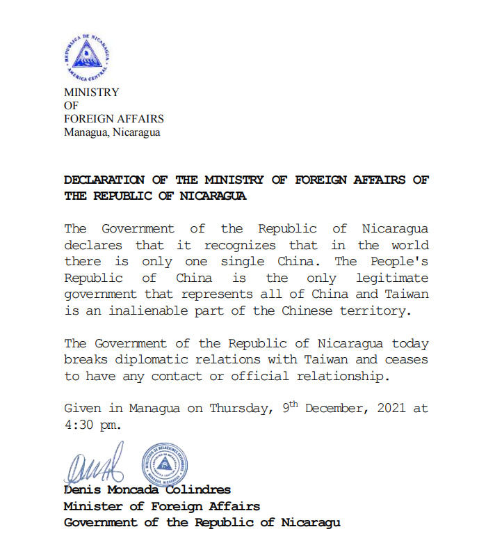 “O governo da República da Nicarágua rompeu hoje as rela??es diplomáticas com Taiwan e deixou de ter qualquer contato ou rela??o oficial”, conclui o documento.