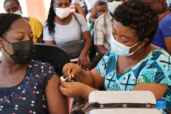 Funcionária médica administra uma dose da vacina de COVID-19 em uma pessoa em um centro de vacina??o em Acra, Gana, no dia 13 de dezembro de 2021. Gana confirmou as primeiras infec??es comunitárias da variante ?micron, afirmou o Servi?o de Saúde de Gana (GHS) no final do domingo.