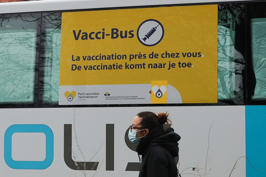 Uma mulher passa em ?nibus para vacina??o em Bruxelas, Bélgica, em 30 de novembro de 2021. (Zheng Huansong / Xinhua)