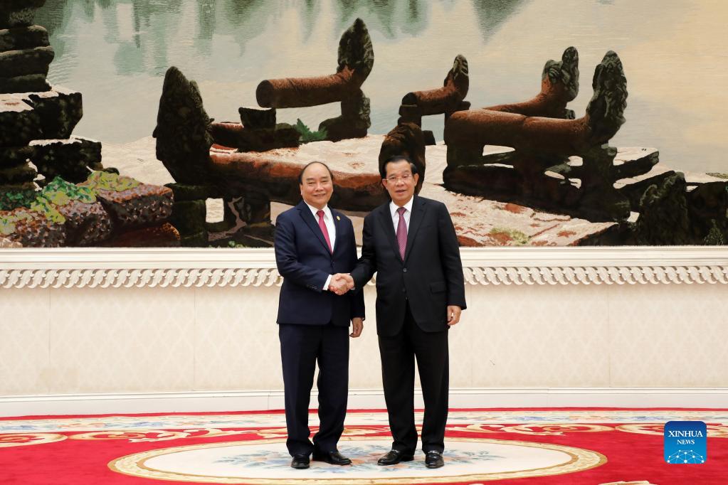 O primeiro-ministro cambojano, Samdech Techo Hun Sem, e o presidente vietnamita visitante, Nguyen Xuan Phuc, presidiram a cerim?nia de assinatura após sua reuni?o no Palácio da Paz em Phnom Penh.