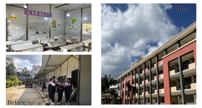 Para Wang Fengjiao, que mora e leciona no condado de Yongde, na província de Yunnan, as chuvas costumavam ser uma fonte de ansiedade por meses a fio. Sempre que chovia, ela só pensava na filha, que estava estudando em uma sala de aula improvisada que n?o era à prova de chuva. Até julho de 2020, junto com outros 400 alunos, a filha de Wang ainda estudava em salas de aula improvisadas. Como a estrutura n?o era totalmente vedada, era particularmente suscetível ao vento e à chuva.