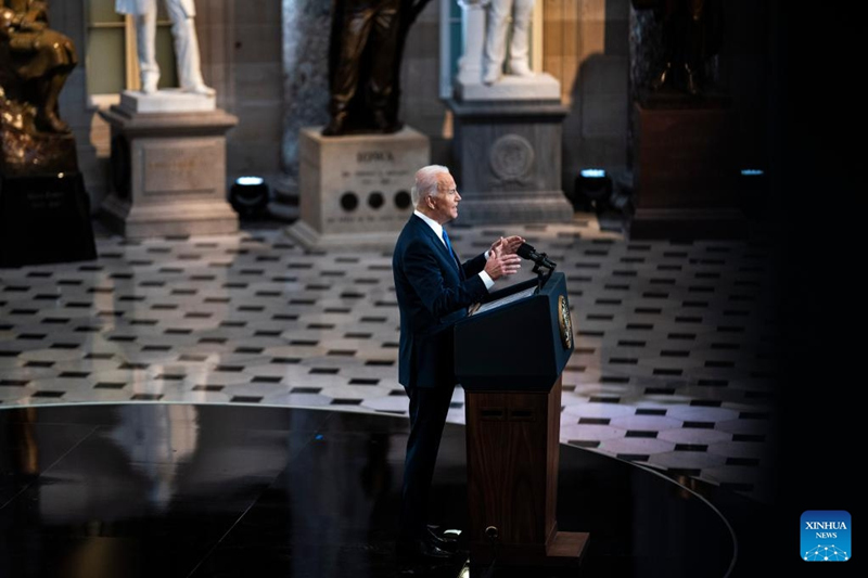 "Há um ano, hoje, neste lugar sagrado, a democracia foi simplesmente atacada. A vontade do povo estava sob ataque. Nossa Constitui??o enfrentou as mais graves das amea?as", disse Biden em um discurso do Statuary Hall, fora da Camara para marcar o aniversário do ataque de 6 de janeiro ao Capitólio.