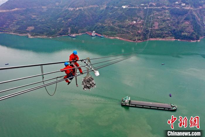 Um grupo de engenheiros, conhecidos como "homens-aranha", têm instalado equipamentos no rio Xiajiang, na área das Barragem das Três Gargantas, província de Hubei, para garantir a opera??o segura da linha do projeto de transmiss?o Baihetan-Jiangsu ± 800 kV UHVDC.