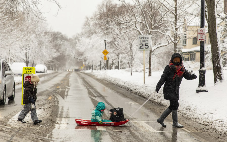 Uma mulher e seus filhos atravessam uma estrada em Evanston, ao norte de Chicago, Illinois, Estados Unidos, no dia 26 de janeiro de 2021. (Foto por Joel Lerner/Xinhua)