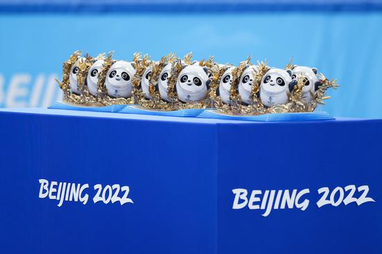 A mascote de Beijing 2022, Bing Dwen Dwen, será concedida aos medalhistas do revezamento misto da equipe de patina??o de velocidade em pista curta antes da cerim?nia de premia??o no Ginásio Indoor da Capital, em Beijing, em 5 de fevereiro de 2022. (Foto: Xinhua)