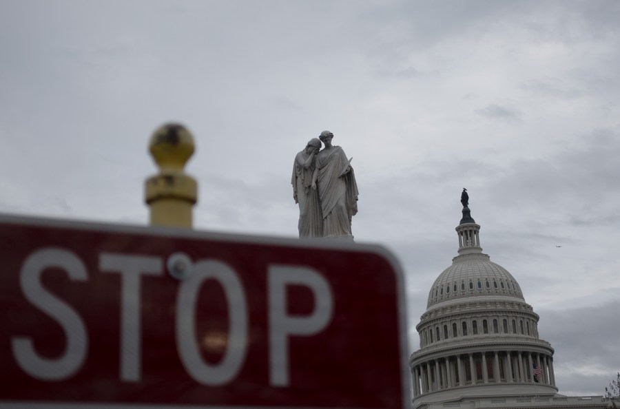O Capitólio dos EUA e uma placa escrito pare s?o vistos em Washington D.C., Estados Unidos, em 13 de fevereiro de 2020. (Foto: Liu jie/Xinhua)