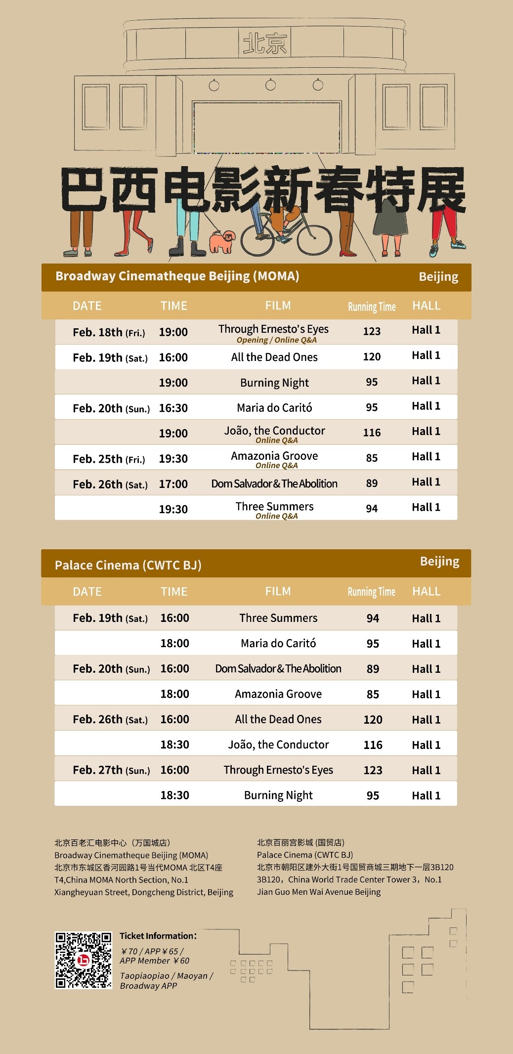 Após o tradicional Festival da Primavera da China, é a vez de Beijing contemplar os oito filmes brasileiros do festival. A exibi??o acontecerá na Cinemateca Broadway de Beijing (MOMA) e no Palace Cinema (CWTC BJ) de 18 a 27 de fevereiro.