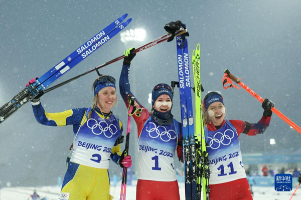 Outra norueguesa, Tiril Eckhoff, terminou em terceiro com três faltas, cruzando a linha de chegada 1'48"7 depois de sua compatriota.