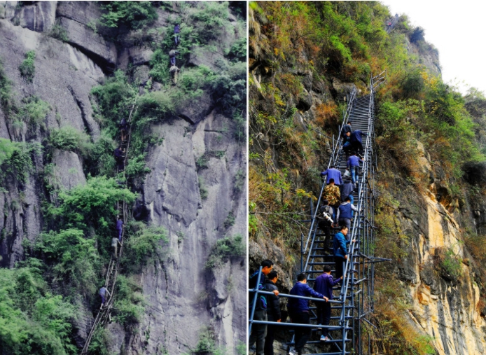 A compara??o entre as duas fotos mostra a mudan?a gerada pela substitui??o de uma escada de vime dos penhascos íngremes para uma de a?o no condado de Zhaojue, província aut?noma de Liangshan Yi de Sichuan.