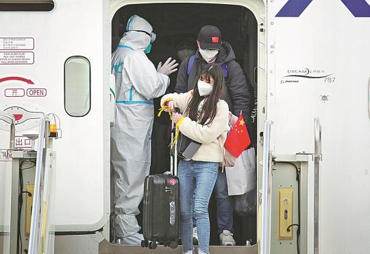 Cidad?os chineses evacuados da Ucrania chegam a um aeroporto em Lanzhou, na província de Gansu, noroeste da China, na quarta-feira. (Foto: Xinhua)
