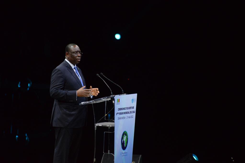 O presidente senegalês, Macky Sall, fala na cerim?nia de abertura do 9o Fórum Mundial da água em Dacar, Senegal, no dia 21 de mar?o de 2022. (Foto por Dieylani Seydi/Xinhua)