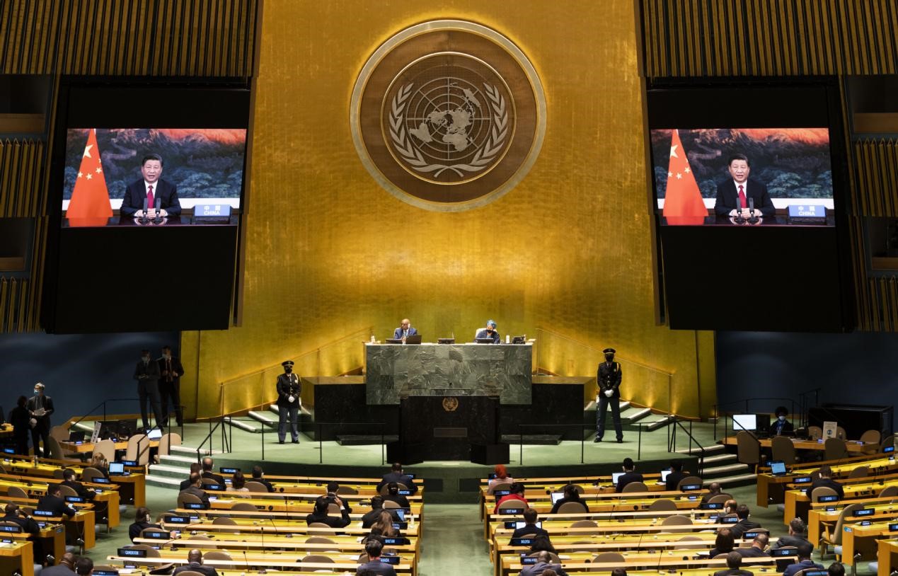 O presidente chinês Xi Jinping discursa no Debate Geral da 76a Sess?o da Assembleia Geral da ONU. (Foto retirada do site da ONU)