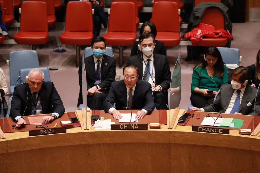 Zhang Jun (centro na frente), representante permanente da China nas Na??es Unidas, fez comentários explicativos depois da vota??o sobre a situa??o na Ucrania, na sede a ONU em Nova York, em 23 de mar?o de 2022. (Xinhua/Xie E)