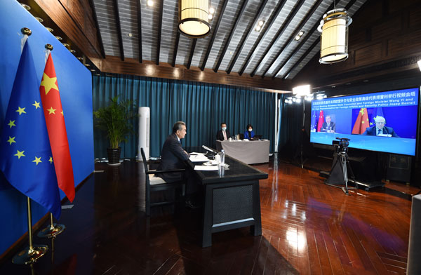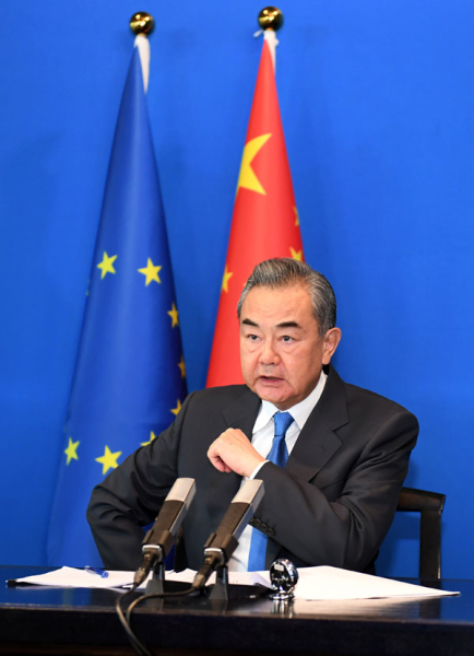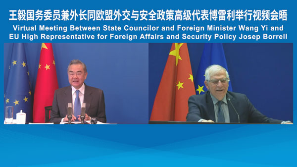 O conselheiro de Estado e ministro das Rela??es Exteriores da China, Wang Yi, realizou nesta ter?a-feira uma videoconferência com Josep Borrell, alto representante da Uni?o Europeia para Negócios Estrangeiros e Política de Seguran?a, em Tunxi, Província de Anhui, no leste da China.