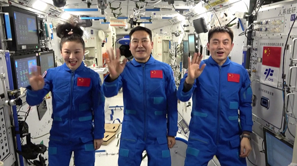 Os membros da tripula??o da Shenzhou-13 -- Zhai Zhigang, Wang Yaping e Ye Guangfu -- est?o em boas condi??es, disse a agência, acrescentando que eles planejam retornar à Terra em meados de abril.