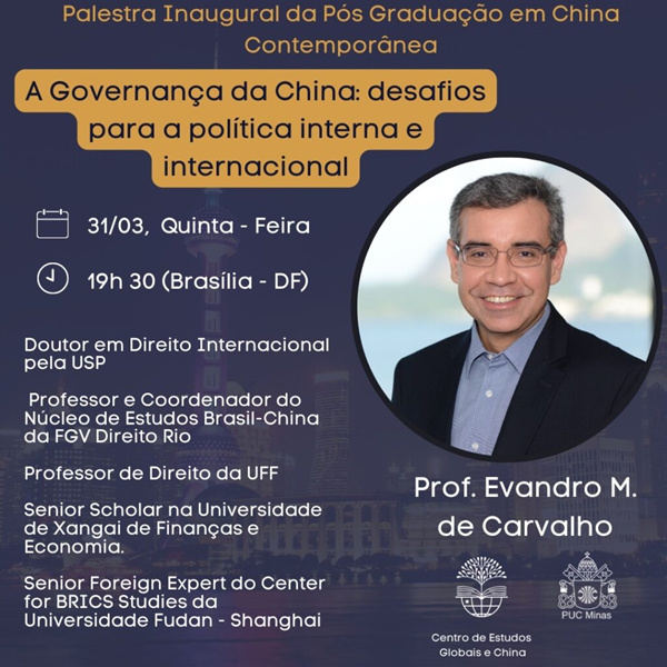 Na aula inaugural realizada no dia 31, prévia ao início do curso, o professor Evandro Menezes de Carvalho fez uma palestra sobre a Governan?a da China: Desafios para a política interna e internacional.