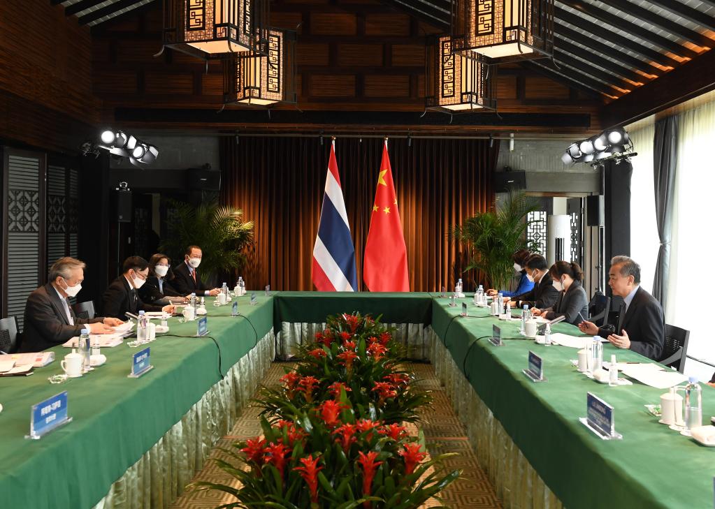 O conselheiro de Estado e ministro das Rela??es Exteriores chinês, Wang Yi, manteve conversa??es no sábado com o vice-primeiro-ministro e ministro das Rela??es Exteriores tailandês, Don Pramudwinai, em Tunxi, Província de Anhui, no leste da China, com os dois lados concordando em promover la?os bilaterais.