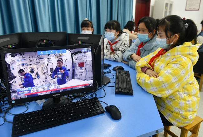 Alunos do ensino fundamental no condado de Zigui, Yichang, província de Hubei, no centro da China, assistem à segunda aula ao vivo ministrada por membros da tripula??o do Shenzhou-13, em 23 de mar?o de 2022. (Foto: Wang Huifu / Diário do Povo Online)