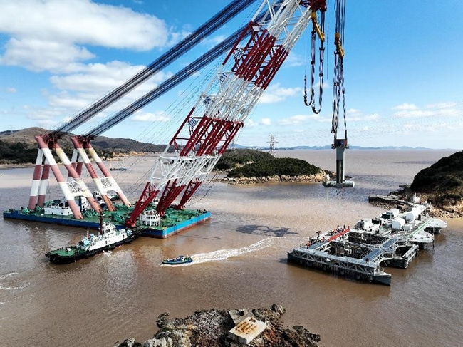 Uma unidade geradora de energia maremotriz de quarta gera??o desenvolvida independentemente pela China é colocada no mar em Zhoushan, província de Zhejiang, leste da China, em 24 de fevereiro de 2022. A unidade pesa 350 toneladas e tem capacidade de 1,6 MW. (Foto: Yao Feng/Diário do Povo Online)