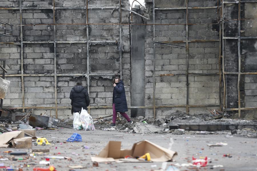 Pessoas passam por um prédio danificado em Mariupol, em 14 de abril de 2022. (Victor/Xinhua)