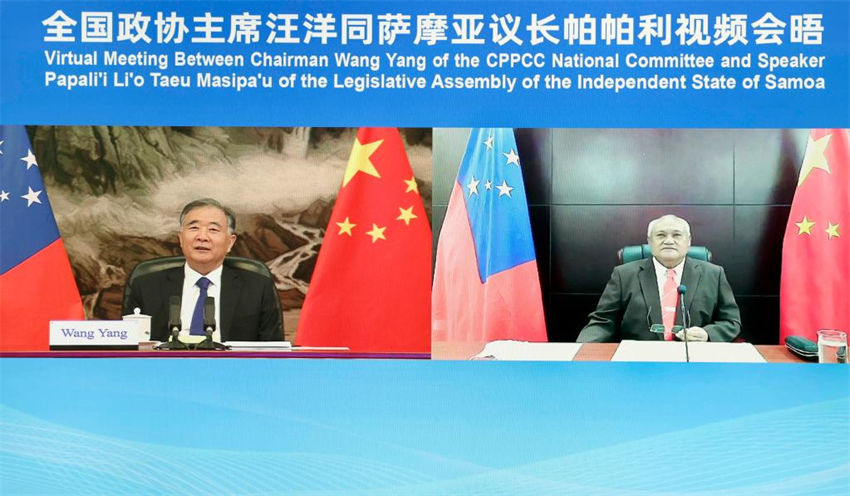 O mais alto conselheiro político da China, Wang Yang, reuniu-se na ter?a-feira por videoconferência com Papali'i Li'o Taeu Masipa'u, presidente da Assembleia Legislativa do Estado Independente de Samoa.