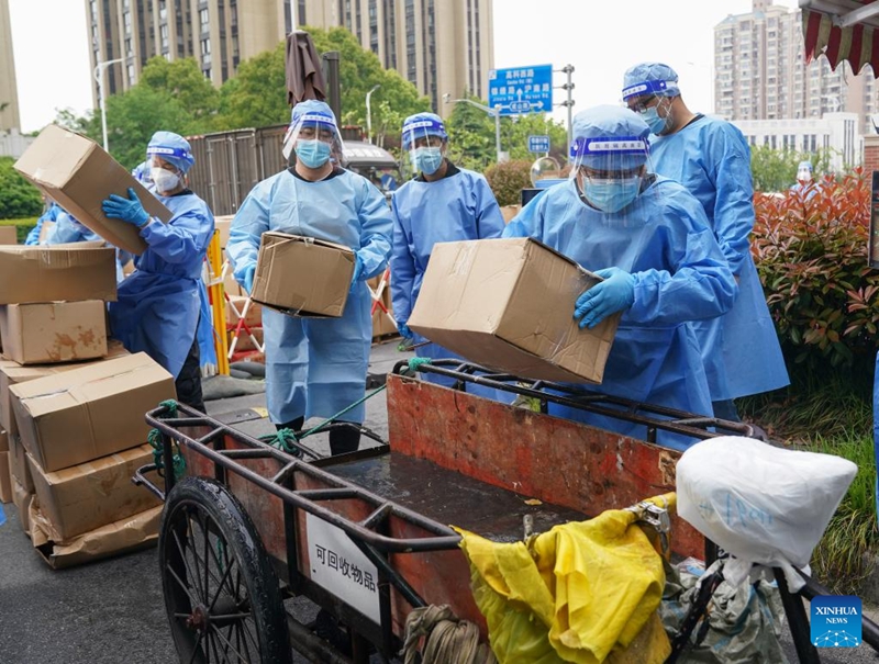 Funcionários carregam suprimentos para residentes em um pedicab em uma comunidade na Nova área de Pudong, Shanghai, leste da China, em 19 de abril de 2022. (Foto: Ding Ting/Xinhua)