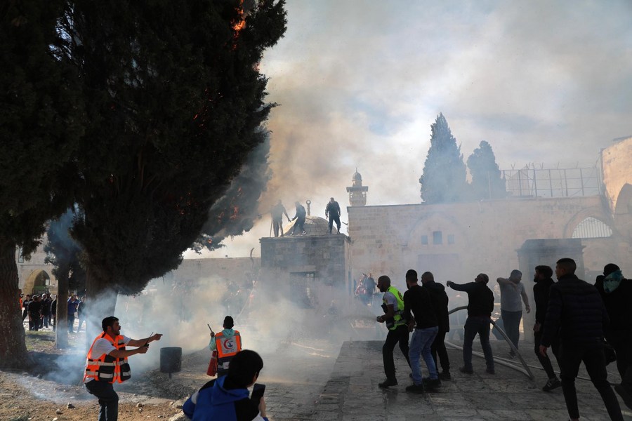 Bombeiros apagam chamas durante confrontos entre for?as de seguran?a israelenses e palestinos no complexo da Mesquita de Al-Aqsa, em Jerusalém Oriental, no dia 22 de abril de 2022. (Foto por Muammar Awad/Xinhua)