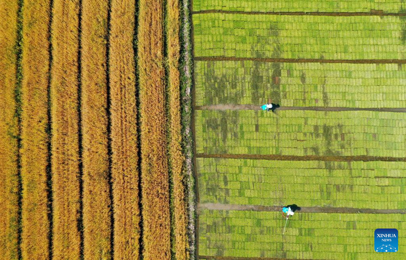 Camponeses trabalhando num terreno de cultivo na vila de Tongliang, distrito de Shuangfeng, província de Hunan, centro do país, em 4 de maio de 2022. (Foto: Li Jianxin/Xinhua)